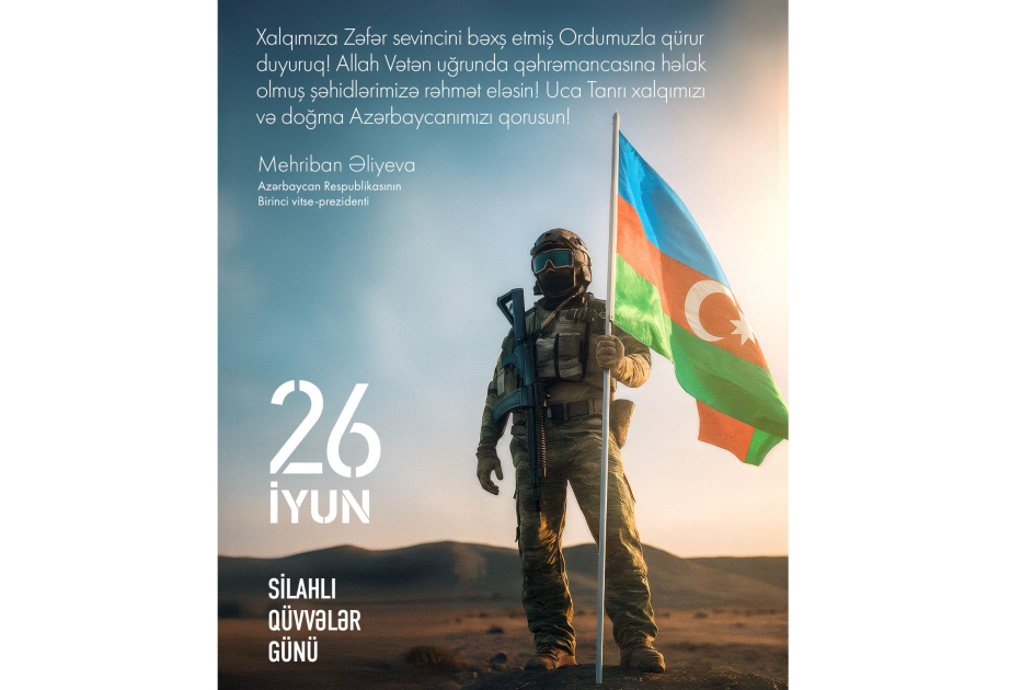 Azərbaycan Respublikasının Birinci vitse-prezidenti Mehriban Əliyeva rəsmi instaqram səhifəsində 26 İyun – Silahlı Qüvvələr Günü münasibətilə paylaşım edib.