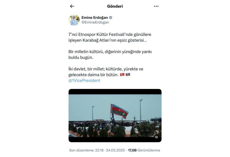 Bu fikirləri Türkiyə Prezidentinin həyat yoldaşı Əminə xanım Ərdoğan VII Etnoidman Beynəlxalq Mədəniyyət Festivalında Azərbaycan nümayəndə heyətinin təqdimatındakı möhtəşəm “Zəfər” şou-kompozisiyasını izlədikdən sonra sosial media hesabında etdiyi paylaşımda bildirib.