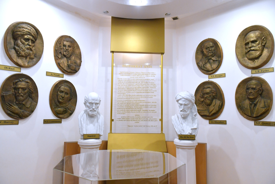 Bunu muzeyin giriş hissəsindəki qranit barelyefin üzərindəki xatirə lövhəsi təsdiq edir. Doqquz zalda nümayiş olunan ekspozisiyaya sənədlər, şəkillər, kitablar, Azərbaycan həkimlərinin tibb alətləri, Azərbaycan Milli Elmlər Akademiyası Məhəmməd Füzuli adına Əlyazmalar İnstitutu, Moskva, Sankt-Peterburq, Bakı şəhərlərinin arxivlərindən götürülmüş qiymətli əlyazmaların fotosurətləri daxildir. Ekspozisiya tarixi ardıcıllıq üzrə yerləşdirilib.